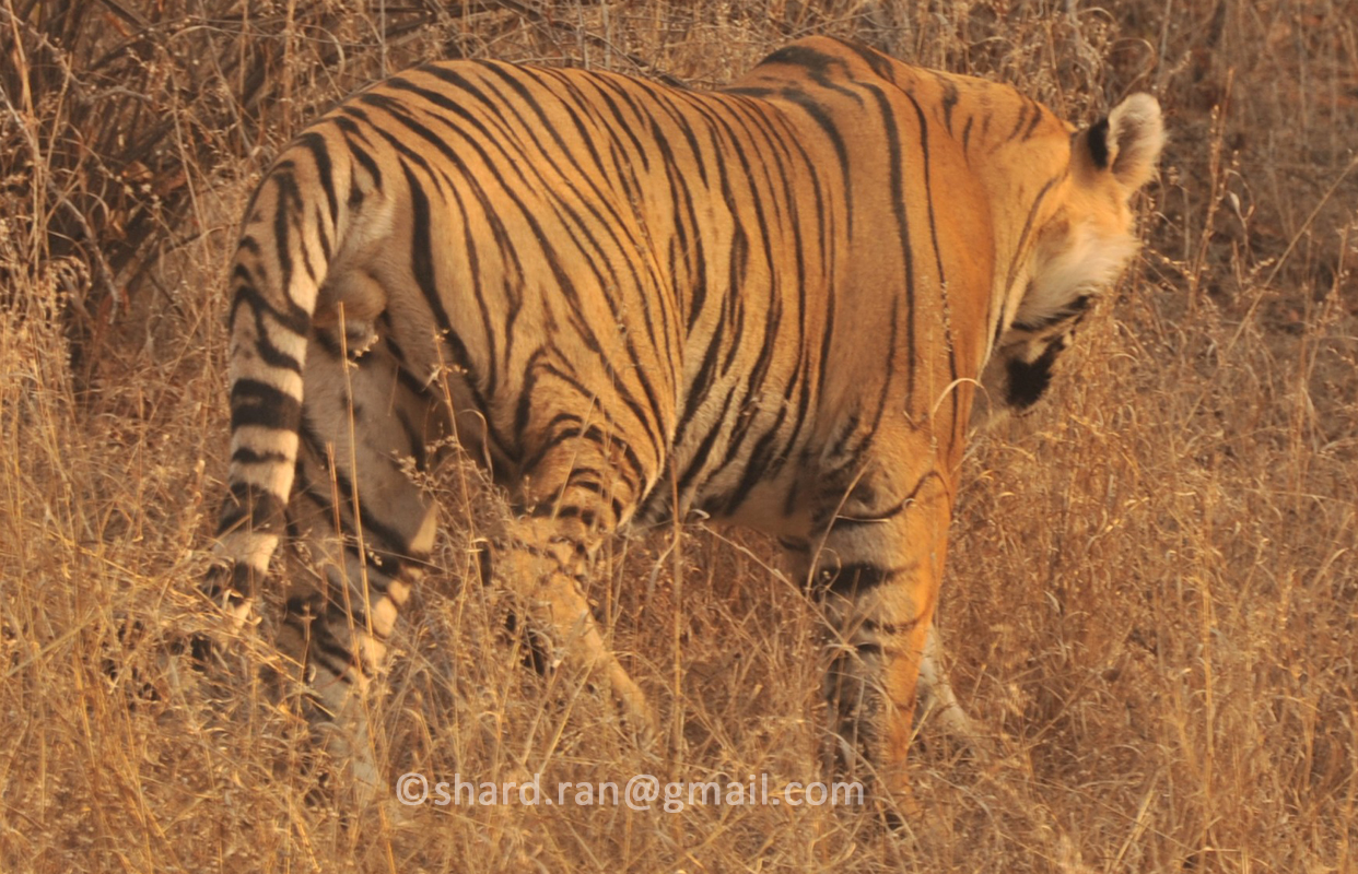 T-86 is the 3rd litter of T-8 aka Ladali . She had given her third litter including the two males, spotted with 3 months old cubs for first time on 4th June 2014 at Chhidi-Kho area at zone no. 7. She shares her territory with a dominate tiger, T-34 known as Kumbha. He is probably fathered her all three litters.